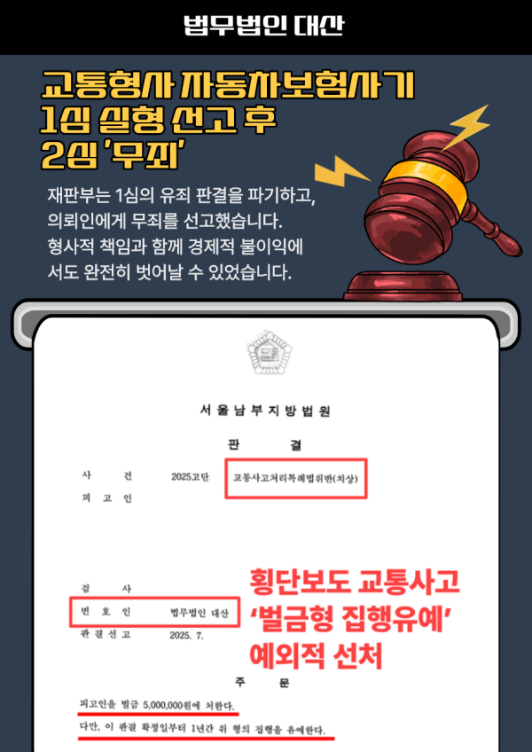 재판부는 1심의 유죄 판결을 파기하고, 의뢰인에게 무죄를 선고했습니다. 또한, 보험회사가 제기했던 배상명령신청도 각하되어 의뢰인은 형사적 책임과 함께 경제적 불이익에서도 완전히 벗어날 수 있었습니다.