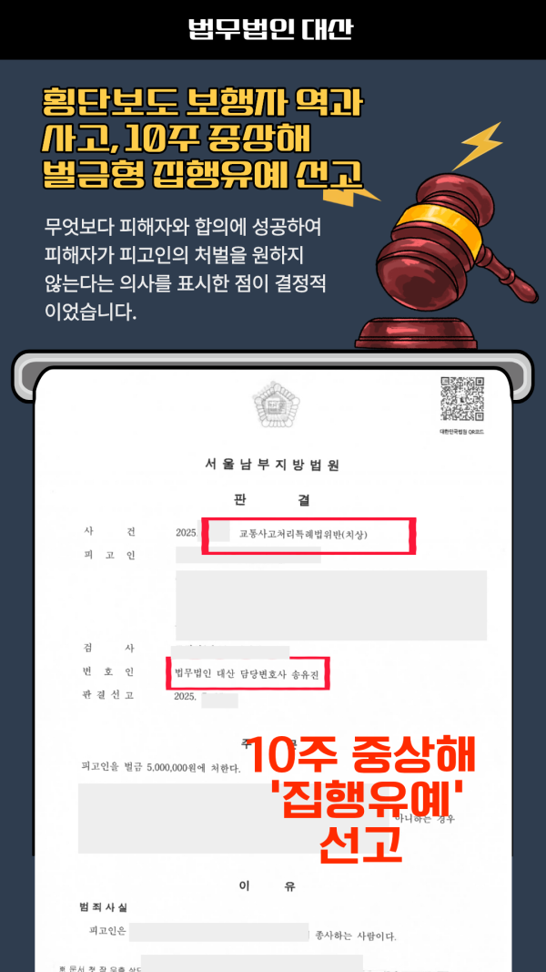 횡단보도 보행자 역과사고, 10주 중상해 벌금형 집행유예 선고